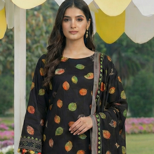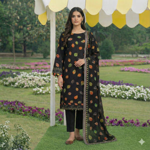 This elegant 3-piece unstitched suit features a sophisticated grey base adorned with vibrant rust and orange floral patterns. Paired with a warm wool shawl, it is the perfect choice for the chilly winter season in Pakistan.