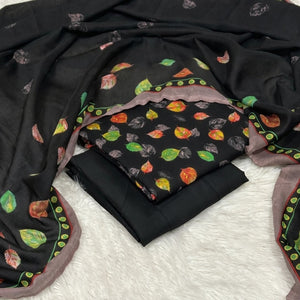 Zahra Zimal Collection: Kotrai Marina with Wool Shawl - Black Leaf Printed Suit - 3 Piece Unstitched (KT002)