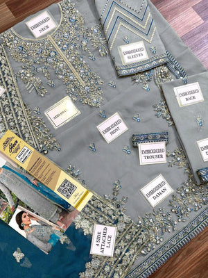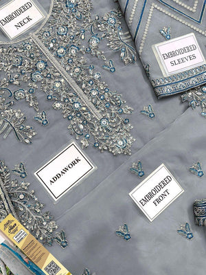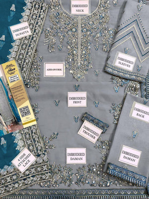 Stand out this wedding season with this striking Grey ensemble from the ZZ. Luxury Collection. Crafted from premium Organza, this suit is elevated by a contrasting Teal (Greenish Blue) dupatta that creates a stunning visual impact. The shirt features exquisite Hand-Embellished Adda Work on the neckline and side chaks, offering a regal, traditional look perfect for Mehndi or Mayoon functions.